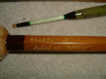 A Milwards Featherlite cane fishing rod. This rod has three sections. This rod is in good condition considering it's age. It is 12ft long. The bottom two sections are cane or bamboo and the top section is split cane. Also on the bottom section it has a serial no. Y352.A.12' All the eyes and whipping are in good condition. It has a full cork butt. Complete with a rod bag.